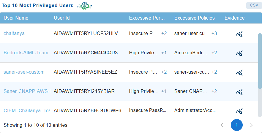 The “Top 10 Most Privileged Users” dashboard allows security teams to quickly identify and assess users with excessive privileges by providing clear visibility into their permissions, attached policies, and supporting evidence. This capability enables effective risk evaluation, supports the enforcement of least-privilege policies, and facilitates timely remediation of over-privileged user accounts.