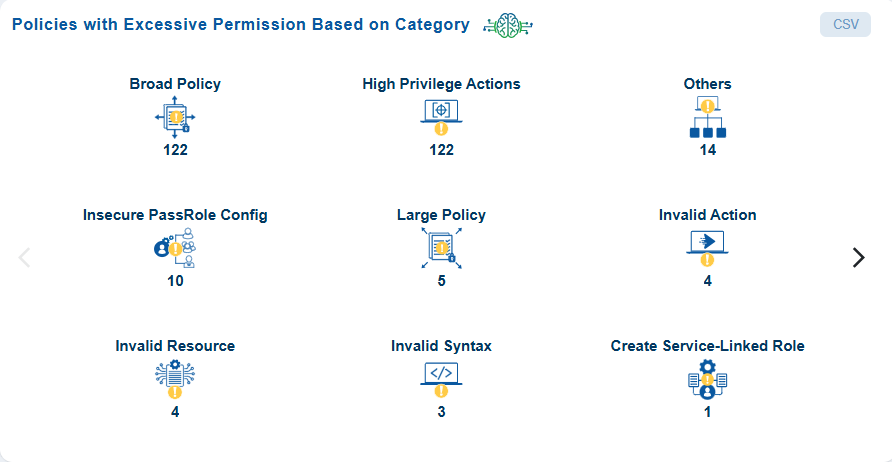 | Policies | Policy Status, Policy Type, Permission Categories (Excessive) |