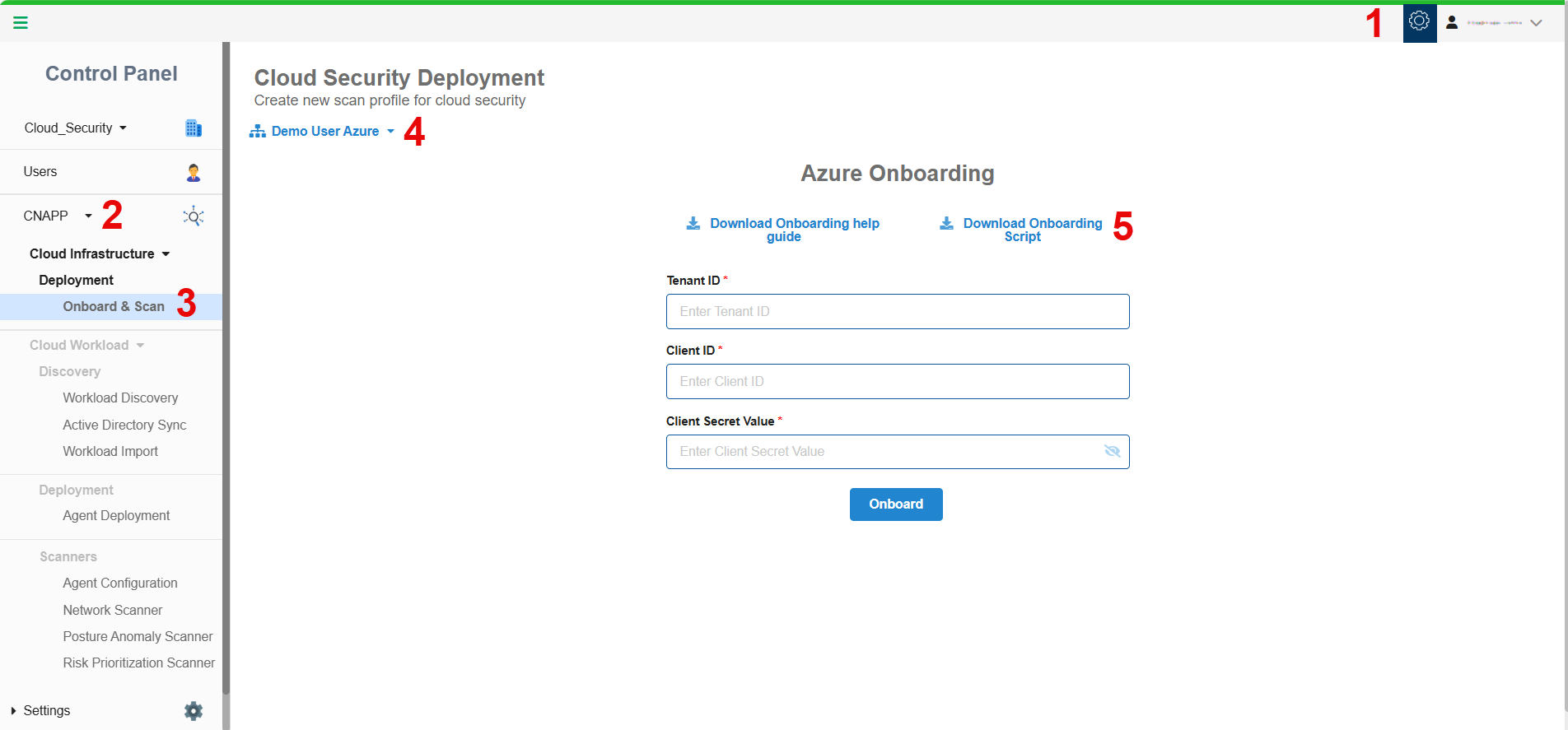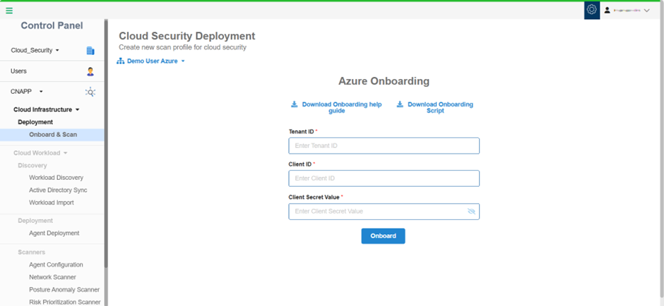 Just make sure to have logged into the application with administrator privileges. You can download the .py or .sh files from the Azure Onboarding page in Saner Cloud Security Deployment.