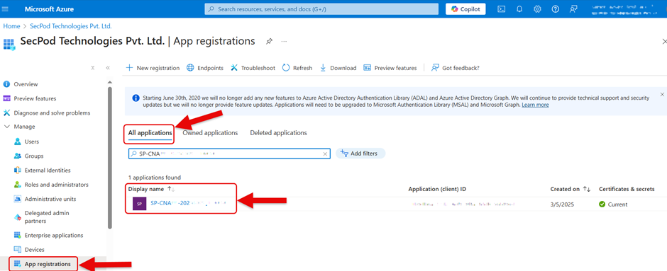 Copy the service principal name from the executed script and paste in the search box under All applications.