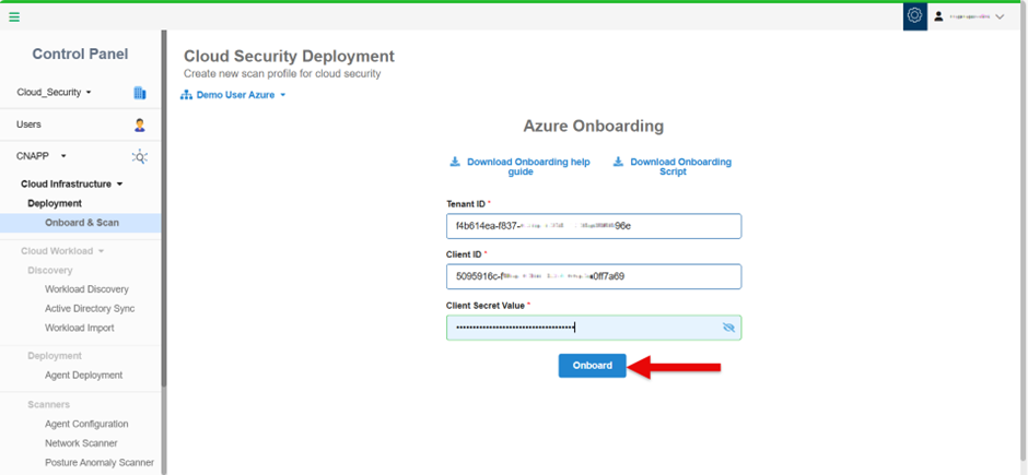 - Choose Onboard and Scan under Cloud Infrastructure Deployment.
