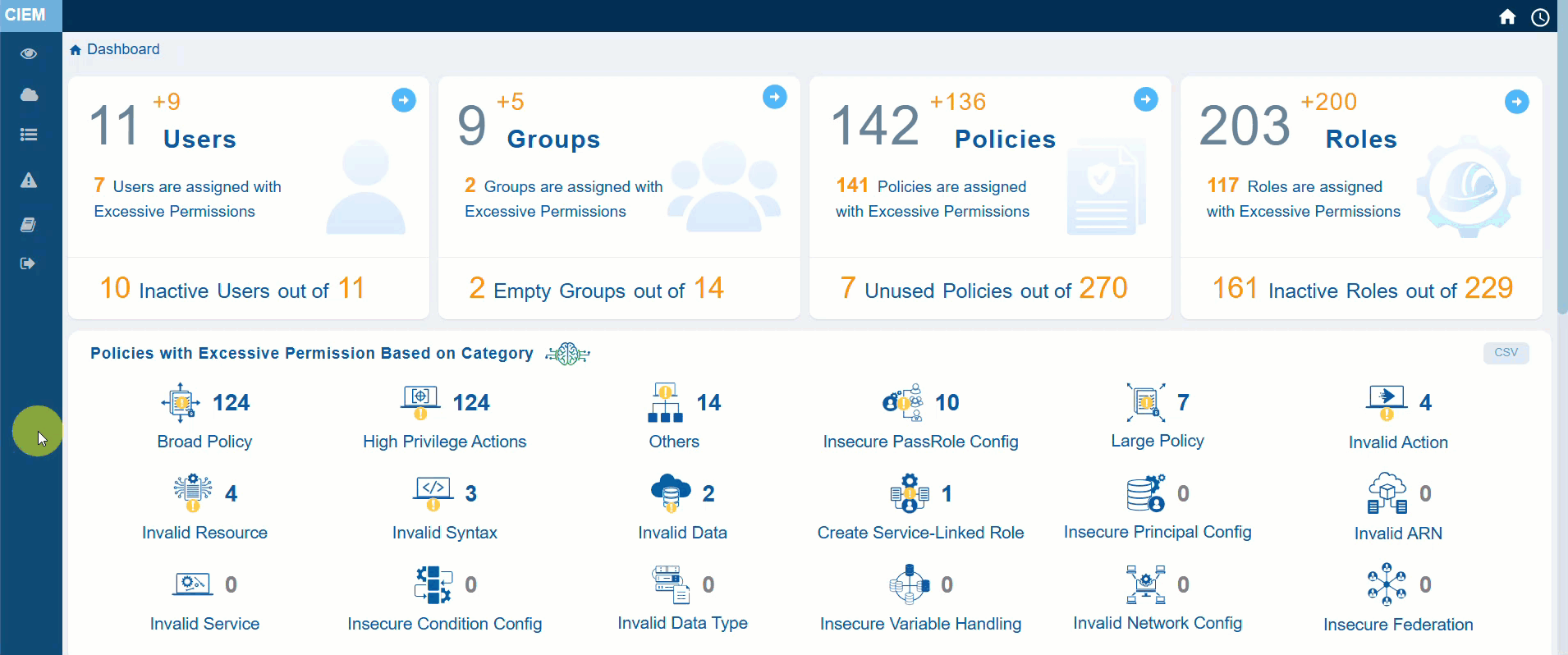 The primary action in CIEM is to get an overview of the Inactive Users, Groups, and Over-Privileged Roles, and Policies. Additionally, the system also provides insight into the excessive permissions across different categories.