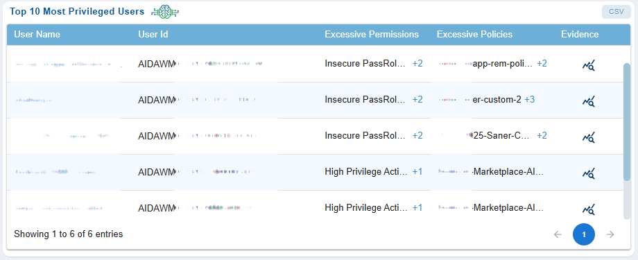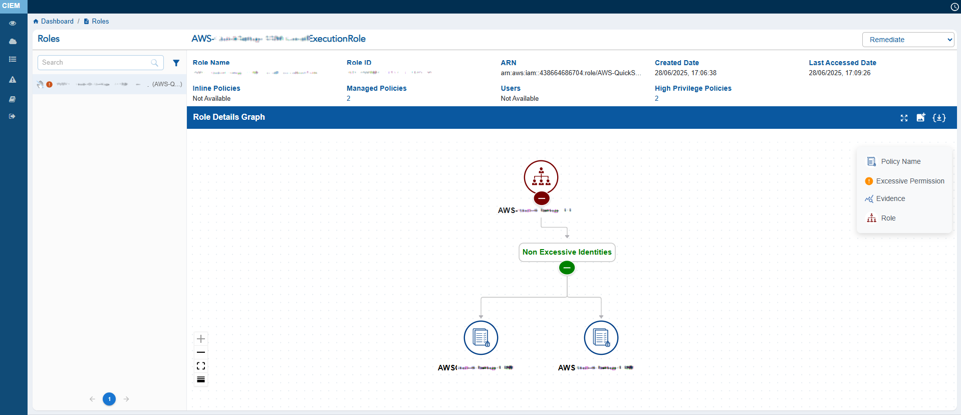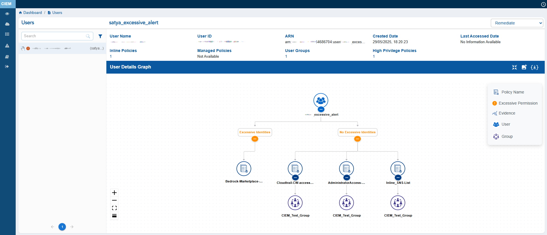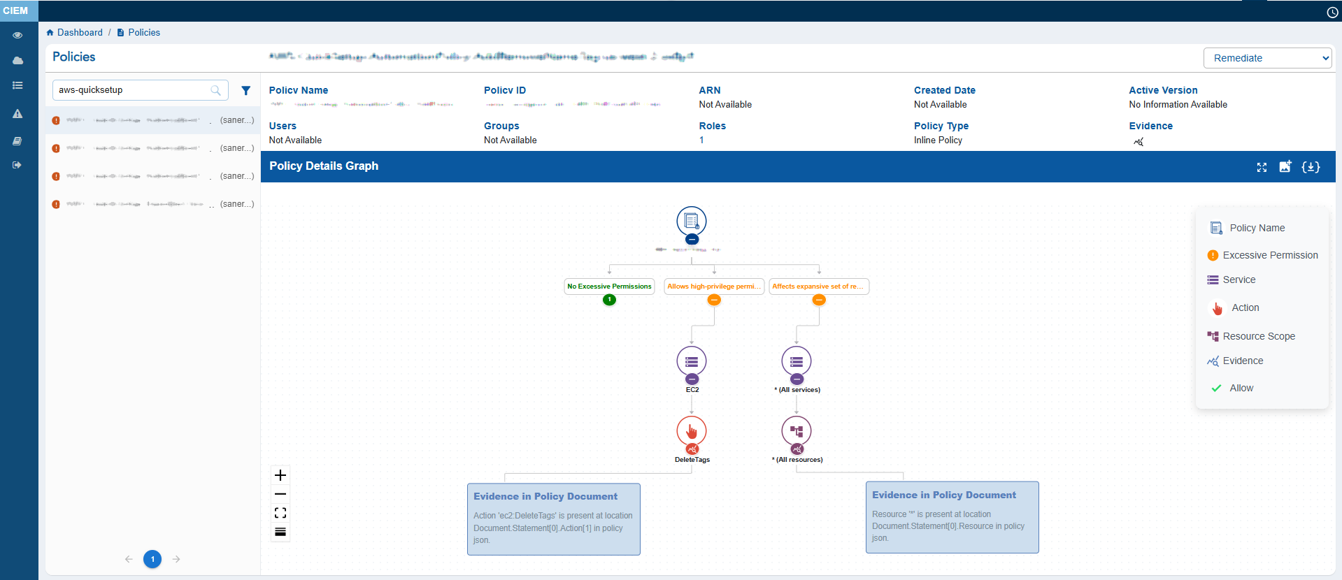 The Evidence for Excessive Permission that can be accessed from the detailed statistics page from any view in the CIEM dashboard provides information on the Excessive permission across Users, Groups, Roles, or Policies.