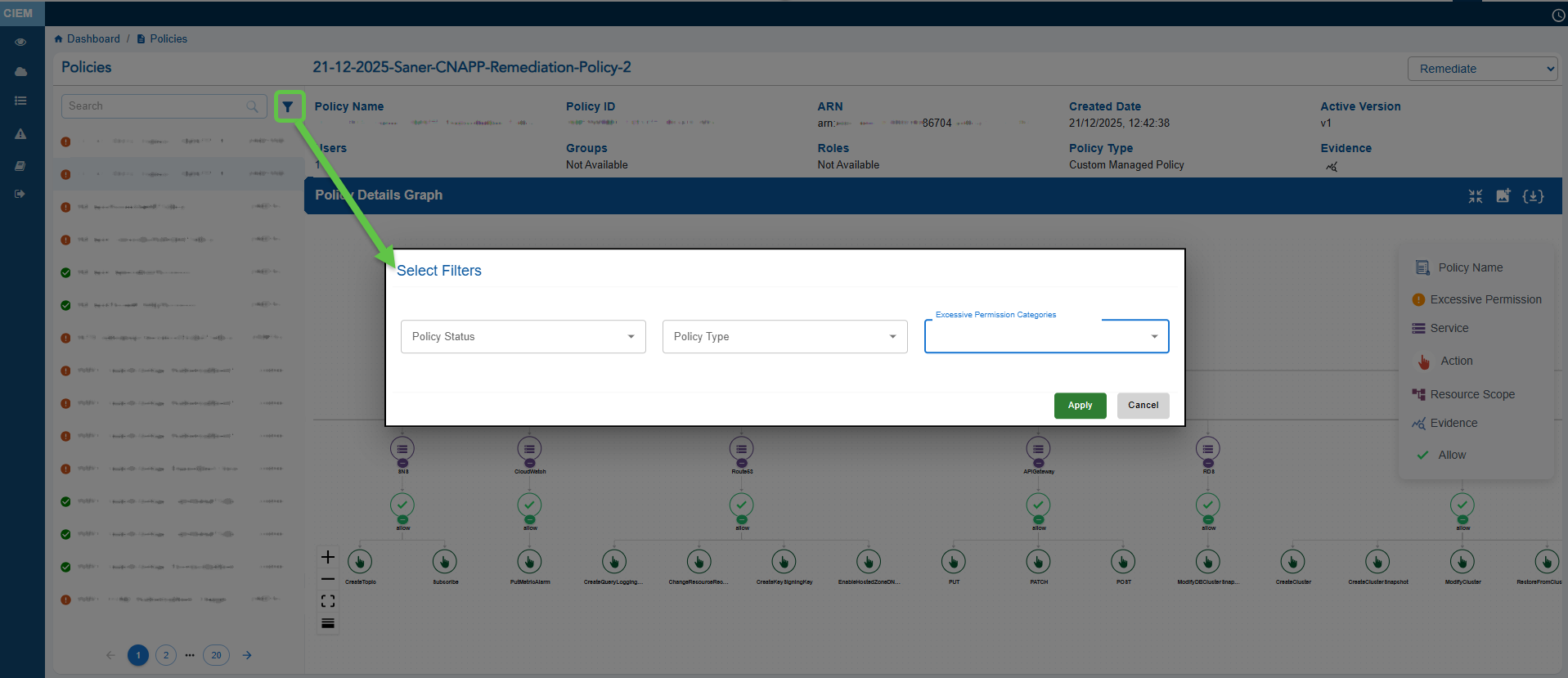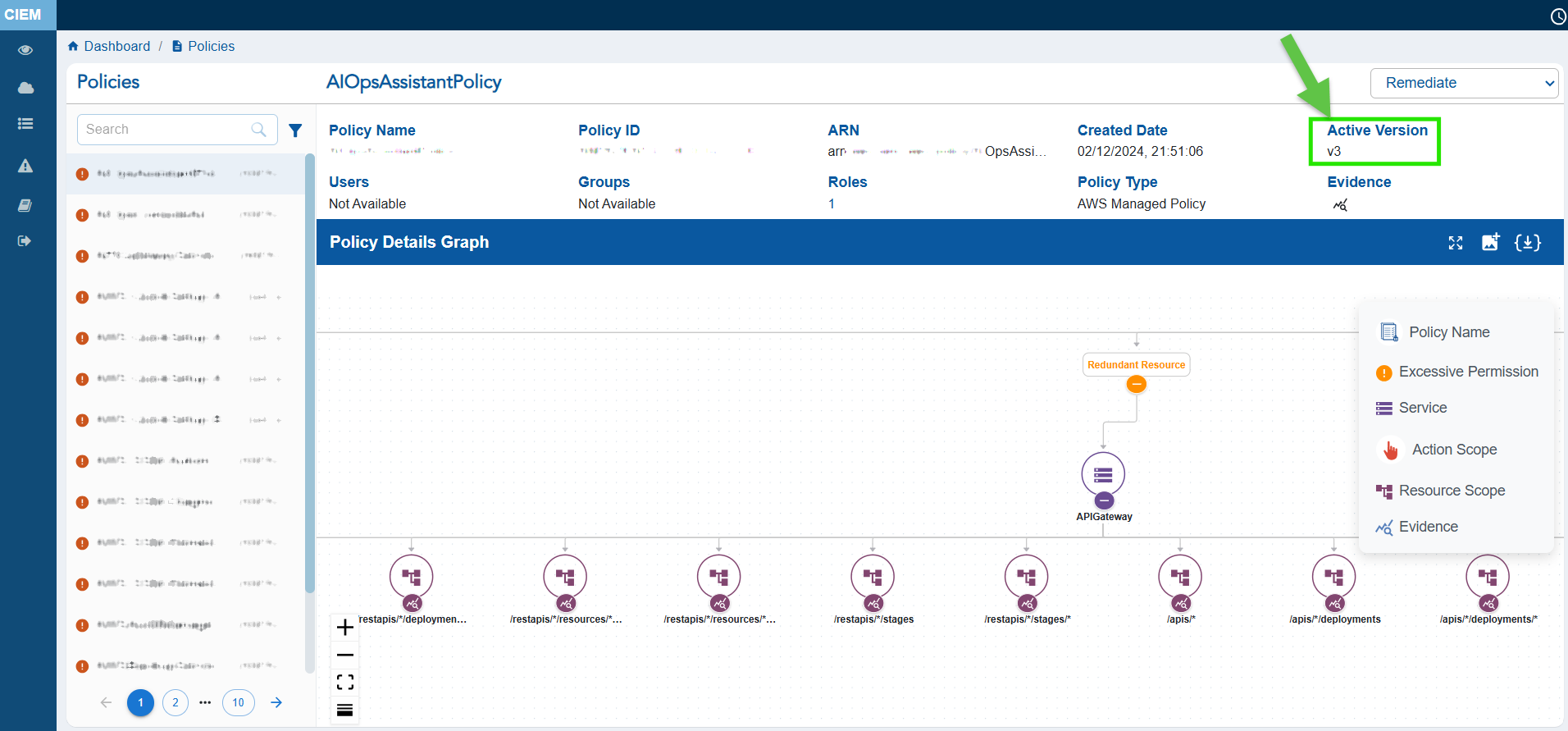 From the CIEM dashboard, click the Policy block and navigate to the Details page that displays the specific version(Active Version) of an IAM policy that is currently in effect for the identity (such as a user, group, or role) to which the policy is attached.