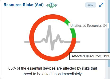 The dashboard chart highlights resources impacted by critical risks requiring immediate remediation (ACT category) and distinguishes them from those that remain unaffected.
