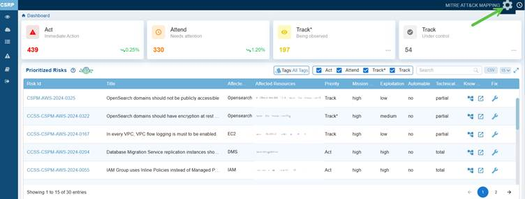 Access the MITRE ATT&CK Framework Mapping from the top-right hand side of the CSRP dashboard.