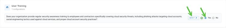 Use the slider(Yes) and turn it on or off to enable or disable the User Training configuration. On turning on the configuration, it evaluates your organization provides regular security awareness training to employees and contractors specifically covering cloud security threats, including phishing attacks targeting cloud accounts, social engineering tactics used against cloud services, and proper cloud account security practices.