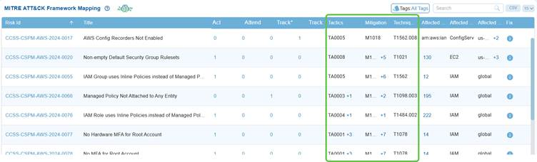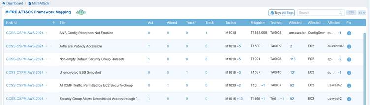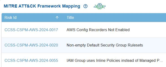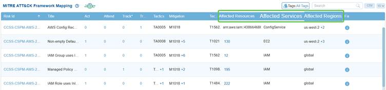 This opens the MITRE ATT&CK Framework Mapping table. Each column provides details on the identified cloud risks as described: