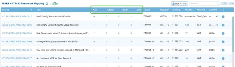 Saner CSRP MITRE ATT&CK Framework Mapping view, the columns Act, Attend, Track*, and Track categorize risks to guide response and remediation efforts.