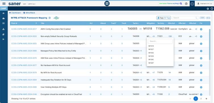 Saner CSRP uses the MITRE ATT&CK Framework Mapping and provides a consolidated view of identified cloud risks aligned with adversarial tactics, techniques, and mitigation strategies in a tabular format. Each risk is mapped to ATT&CK identifiers, showing the impacted assets, affected regions, and recommended fixes. This helps security teams quickly understand how risks relate to real-world attacker behaviours, prioritize response actions, and strengthen defences with a threat-informed approach.