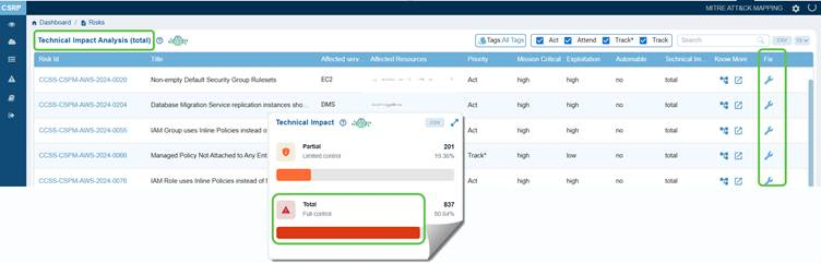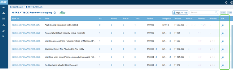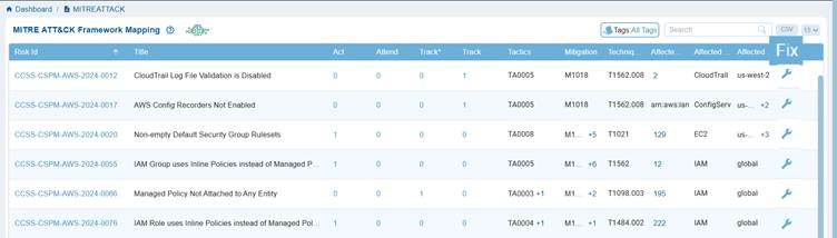 From the CSRP Dashboard, access the MITRE ATT&CK Framework Mapping view. The Fix column provides direct access to remediation guidance for each identified risk. It links the mapped risk, tactic, and technique to actionable steps that security teams can take to mitigate or eliminate the misconfiguration.