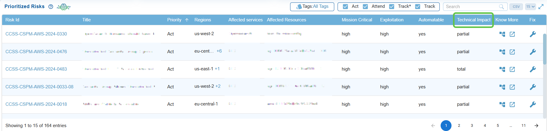 Act highlights risks that need immediate fixing due to their severity or exploitability, while Attend marks those requiring review and further assessment. Track* is used for risks under closer monitoring because of their higher exposure or links to multiple attacker techniques, and Track covers risks that are monitored on a general basis.