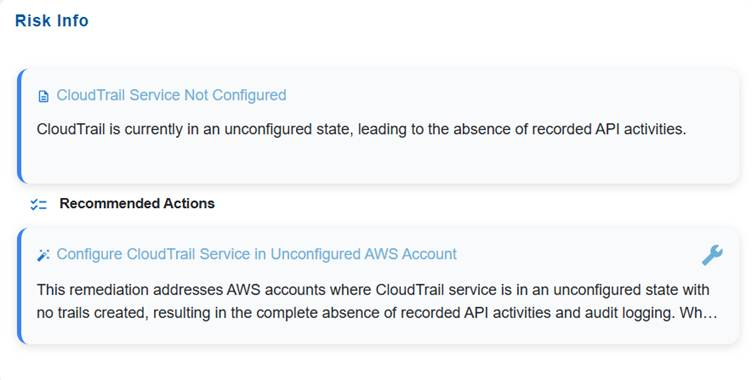 By clicking the Fix icon (indicated as wrench) corresponding to a risk id, Saner CSRP automatically redirects you to the relevant tool for resolution. Click to read more on How to Remediate in Saner Cloud?.