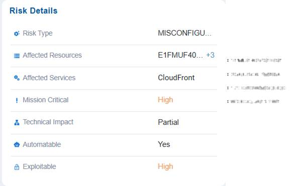 For example, a misconfiguration risk has been identified in resource X within the CloudFront service carries high mission criticality, meaning it could significantly affect core operations if exploited. The technical impact is partial, so while not a complete failure, it could still disrupt functions or expose vulnerabilities. The risk is marked as highly exploitable, making it an attractive target for attackers. Since it is automatable, remediation can be streamlined through automated fixes or security tools, reducing response time compared to manual intervention.