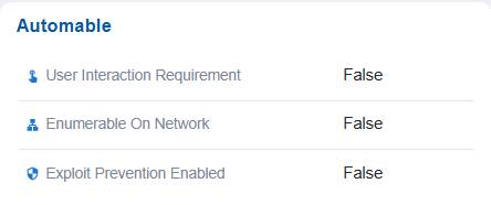 In this case, the Automatable section assesses if the exploit can be automated. In this case, the dashboard indicates that exploit prevention, user interaction requirement, and network enumeration are all set to false, suggesting exploitation would not require additional interaction but also cannot be automatically prevented using existing security controls.