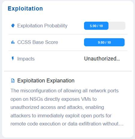 In this example, the Exploitation block values indicate that the issue has a moderate likelihood of exploitation (5.90/10), but carries an extremely high severity score (CCSS 9.80/10), meaning the potential consequences are critical. If successfully exploited, it could lead to unauthorized access or actions, posing a major security concern. The exploitation explanation provides context on how the weakness might be leveraged, emphasizing the need for prioritized remediation despite its moderate probability, since the impact would be highly damaging.