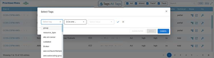 Users have an option to narrow down the list of risks based on relevant attributes, making it easier to focus on specific environments, resource groups, or configurations. Options to clear filters, apply filters, or cancel allow full control over tag-based filtering.