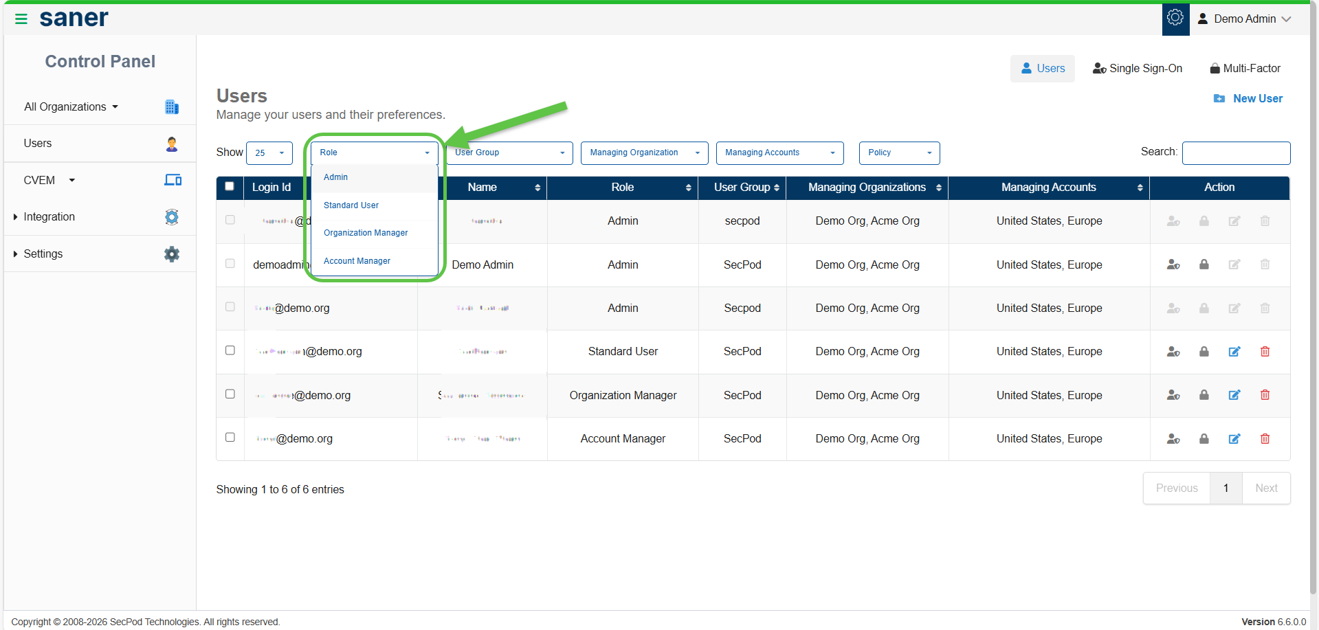 4. You can also manage users with multiple filters like Role-based access, Organizations, Managing organizations, and Managing accounts.