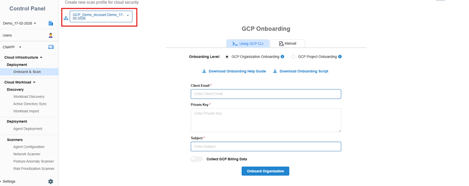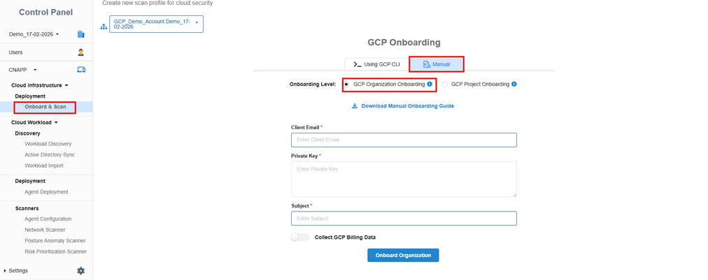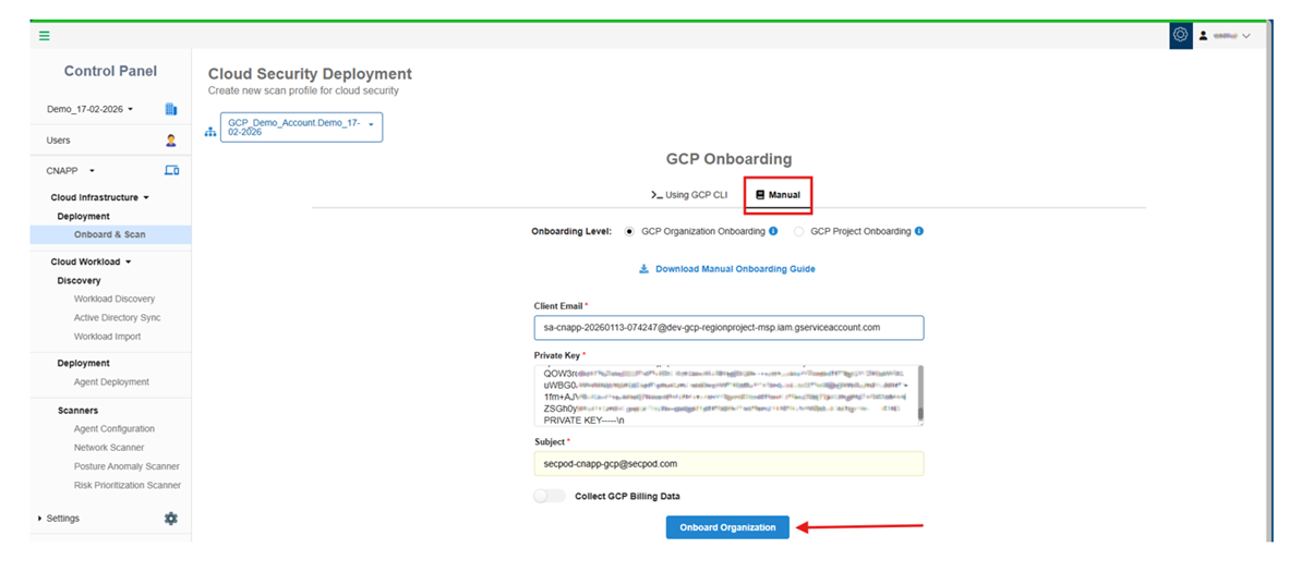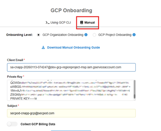 Make sure that the target Google Cloud Platform (GCP) project is linked to an active Billing Account before initiating onboarding. Without an active billing configuration, the onboarding process will not complete successfully.