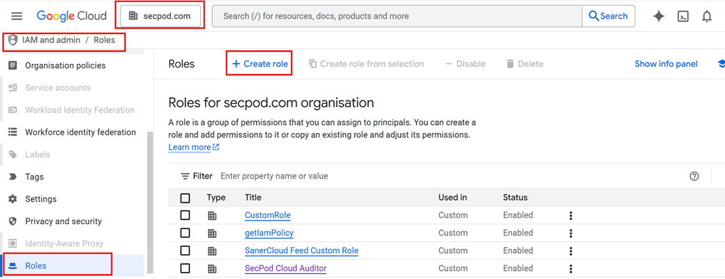 Step6: Click hereto know the permissions need to be added in the Custom Role. Switch to the Organization View, navigate to “Roles” under “IAM and Admin” and click on “Create role”.