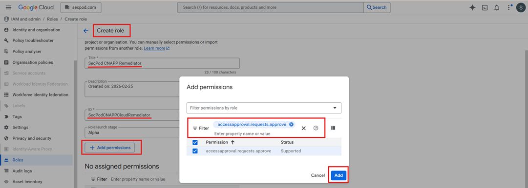 Also, assign the Custom Remediator Role “Saner_CNAPP_Remediation_Role_xxxx_xxxx”, created in Step 7.