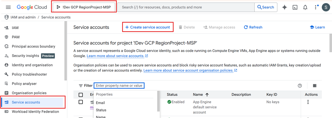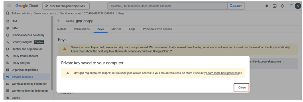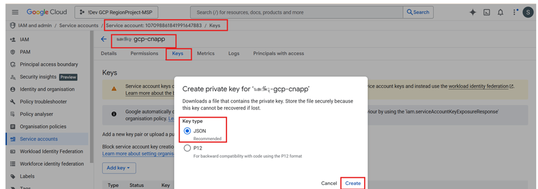 Step17: In order to acquire the Private key required for onboarding, go to Service account Page and navigate to the “Keys” tab. Click on “Add Key” and select “Create new key”, choose the “Key type” as JSON and click on Create.