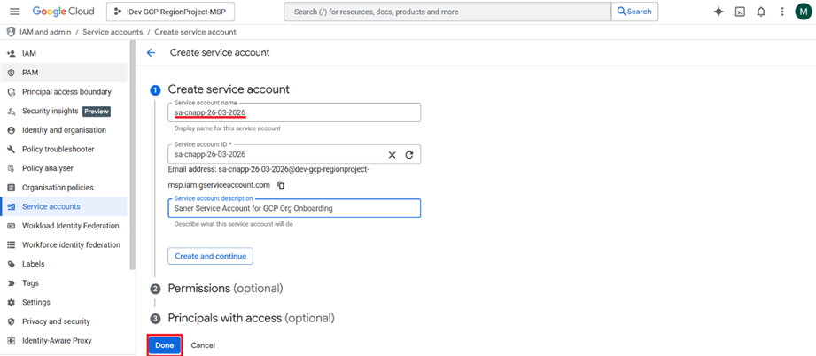 Step9: Enter the “Service Account” Name as sa-cnapp-<date> (e.g. sa-cnapp-16-03-2026) and a relevant description. Click on Done, to create the Service Account.