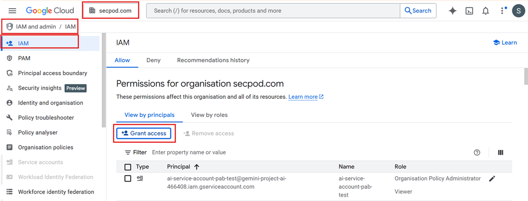 Step12: Navigate to the Organization Page in Google Cloud Console. In “IAM” under “IAM and admin”, click on “Grant Access”.