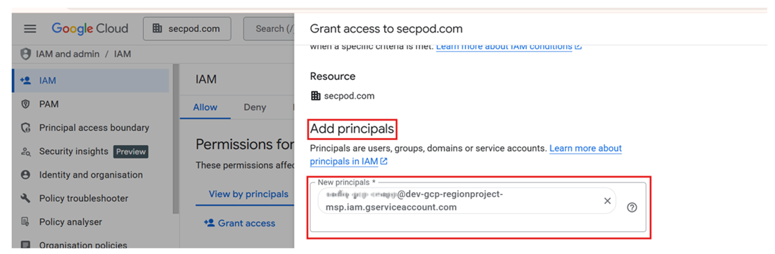 Step13: Add the Name of the Service Account created in Step 9 in “New Principals” section.