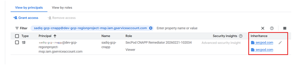 Step15: To verify if above steps were done successfully,switch to the Project where the Service Account was created. Navigate to “IAM” under “IAM and admin” and check that the Service Account has Inherited Viewer and Custom Role which were assigned to the Service Account (e.g. “Saner_CNAPP_Remediation_Role_xxxx_xxxx”) at the Org Level.