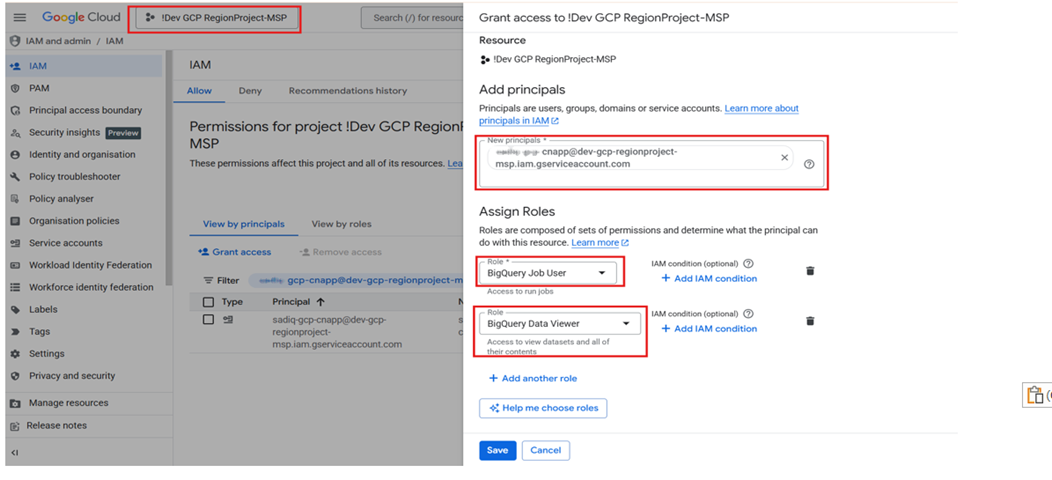 Assign “BigQuery Data Viewer” and “BigQuery Job User” Roles to the Service Account. Else, skip this step.