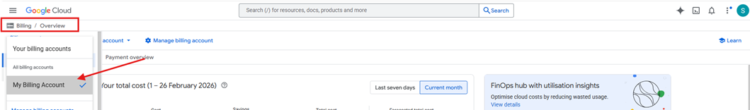 Step26: Navigate to the Billing Console, select the Billing Account which needs to be linked with the Dataset created in Step 25.