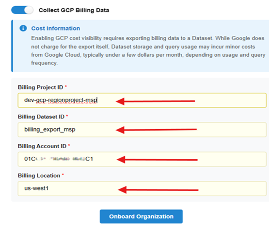 Enable “Collect GCP Billing Data” and fill the Respective “BillingProject ID”, “BillingDataset ID”, “Billing Account Id” and “Billing Location”.