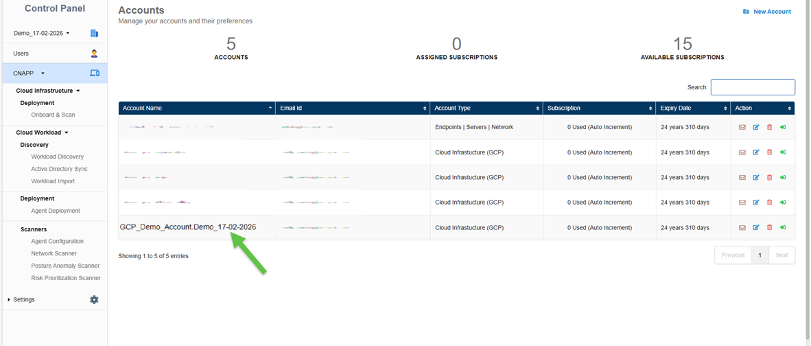 The newly created account displays in the Accounts page within a tabular format with the following details:
