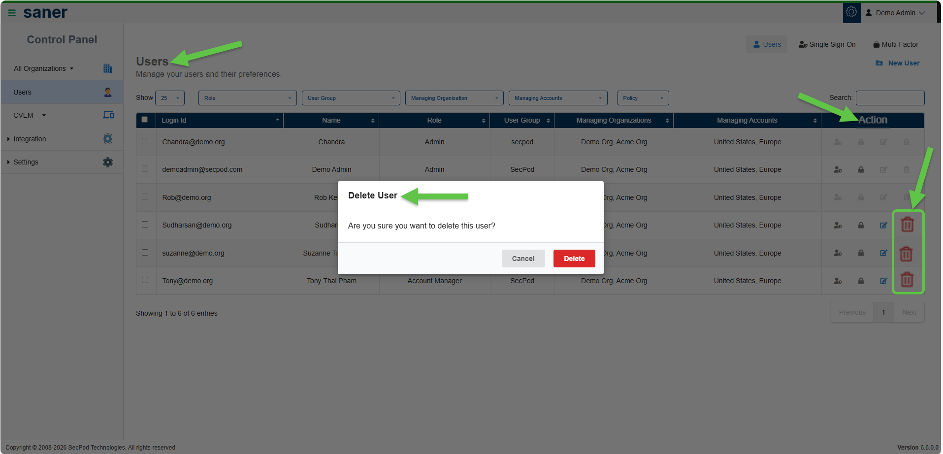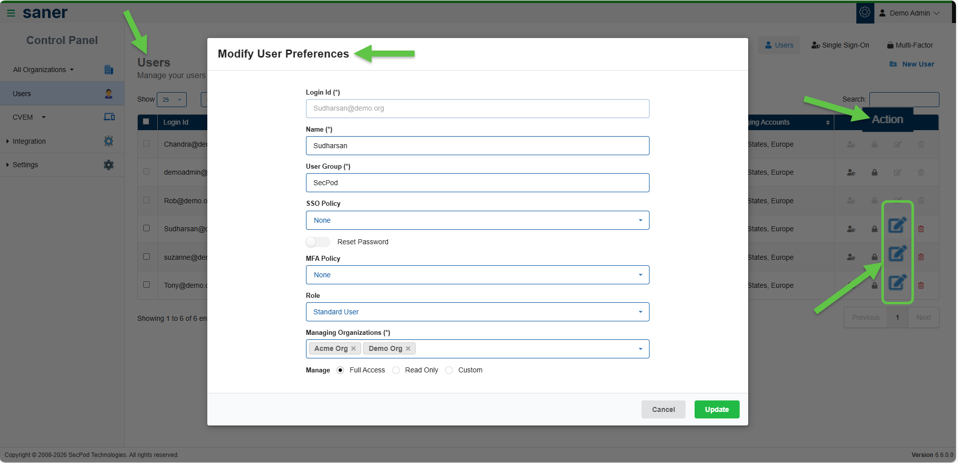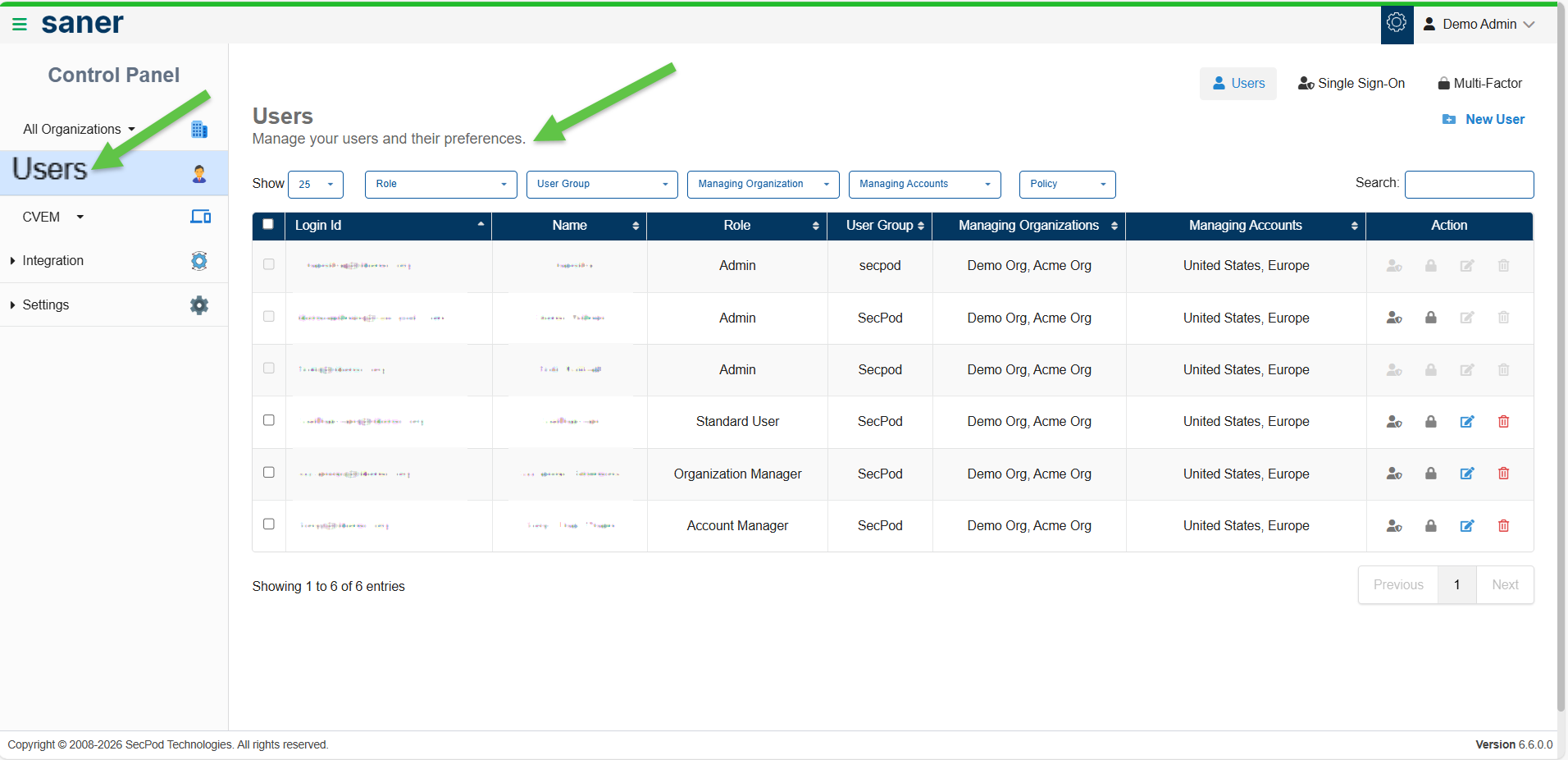 | User access level: You must be logged in as an Admin/Organization Manager/Account Manager to enforce SSO authentication for user accounts in Saner CVEM. |
