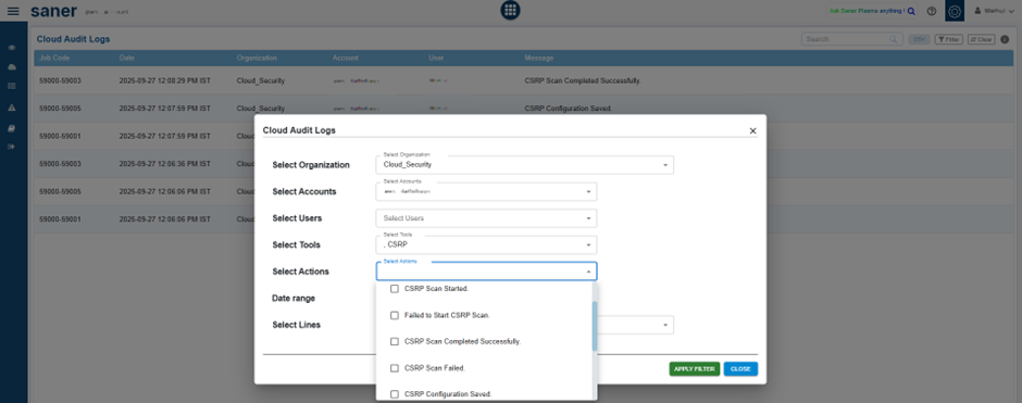 Audit logs for Saner Cloud Risk Prioritization(CSRP) and Cloud Cyber Hygiene Score(CCHS) offer detailed visibility into scans, and configuration changes. These logs help track important actions, such as when a scan begins and ends, as well as updates to configurations for risk prioritization and cloud hygiene scores. This improved oversight facilitates better decision-making based on accurate information.