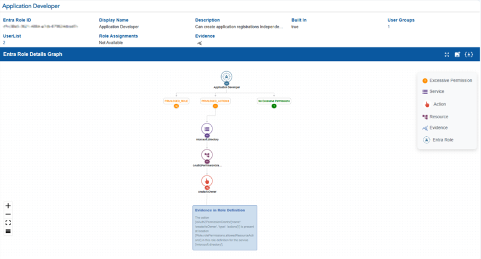 The detailed graphs with flexible layouts, provides clearer visibility into Excessive Permissions, Permissive Actions, and Evidence. Each node emphasizes a key element in the chain of role, permissions, resource, and evidence, making it easier to identify excessive or risky permissions and understand why they are flagged.