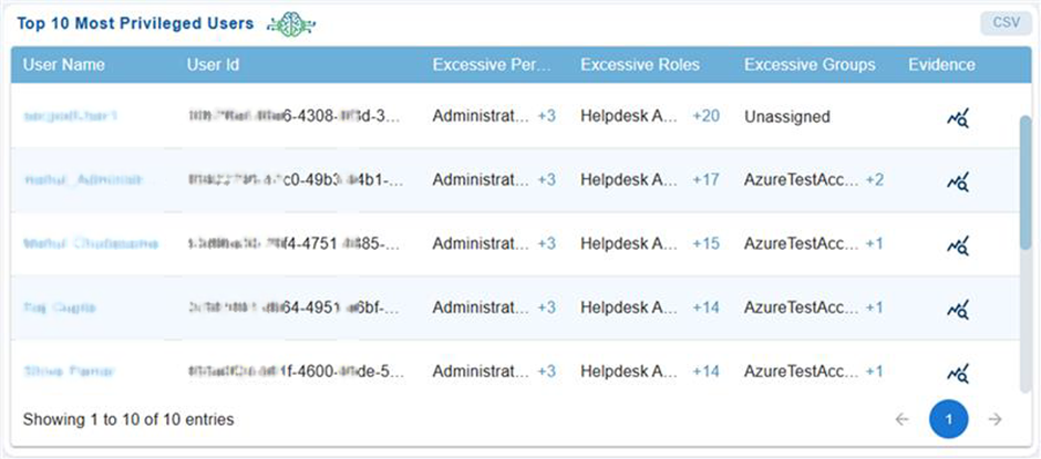 Top 10 Privileged Users offers clear visibility into excessive permissions across roles and groups, supported by compelling evidence.