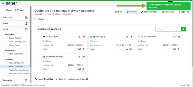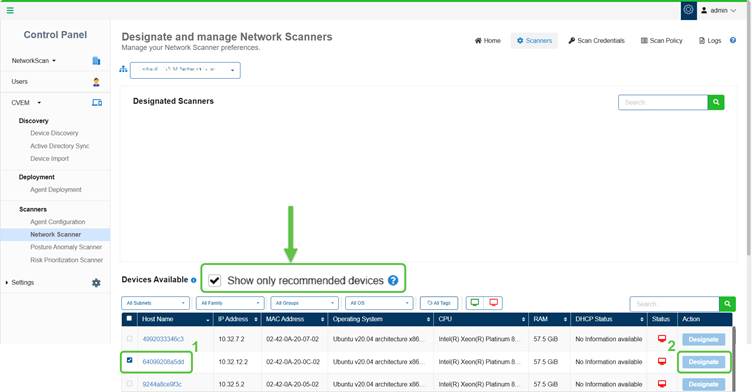 Step2: Click Designate under the Action column. The selected device moves to the Designated Scanners section displaying a success message.