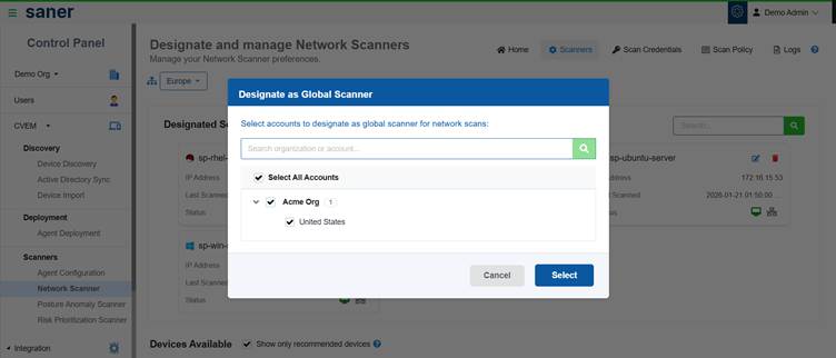 You can designate scanners as Global Scanners to make them available across multiple accounts or an entire organization.