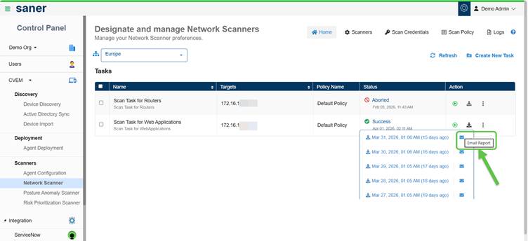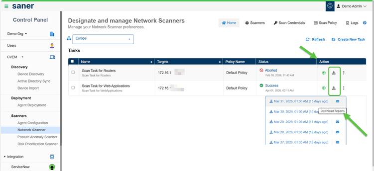 From the Designate and Manage Network Scanners page, click the Download button under the Action column for the corresponding network scan task. This downloads the last five network scan reports.