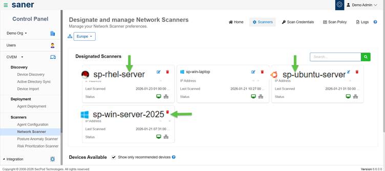 Add and manage network scanners, designate devices as global scanners for use across multiple organizations, sites, or accounts.