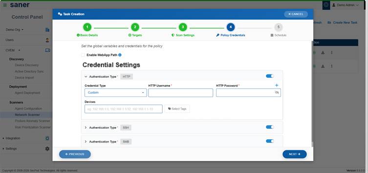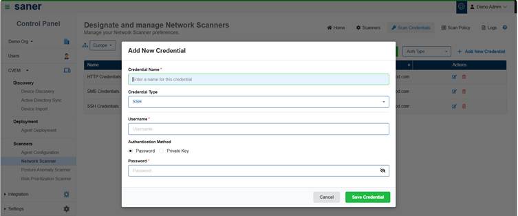 Manage authentication credentials (SSH, SMB, HTTP/HTTPS) used for authenticated scanning.