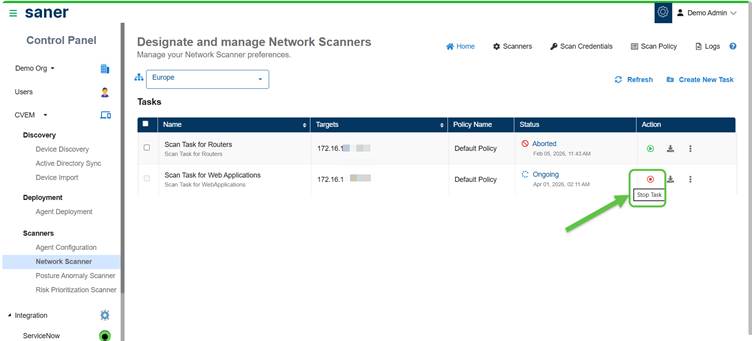 Stop an ongoing scanner task by clicking the Stop Task button under the Actions column. The status of the task then changes to Aborted. If you want to restart the task, then just click the Run on Demand (arrow with circle) button once again.