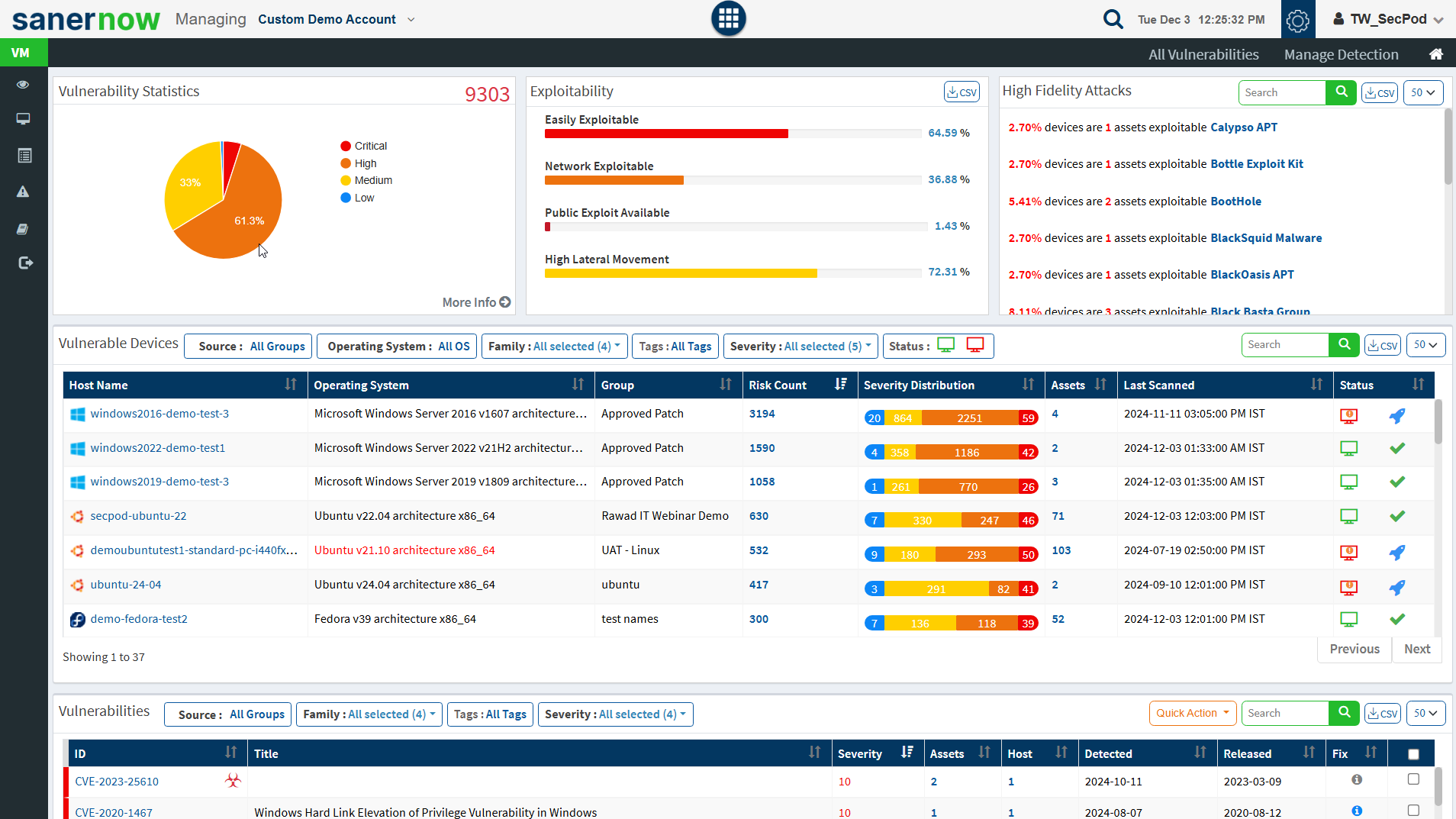 - Click on the Vulnerability Management icon. The Vulnerability Dashboard is displayed, which provides vulnerability details categorized by severity or type, age, affected hosts, vulnerable devices, and vulnerabilities.