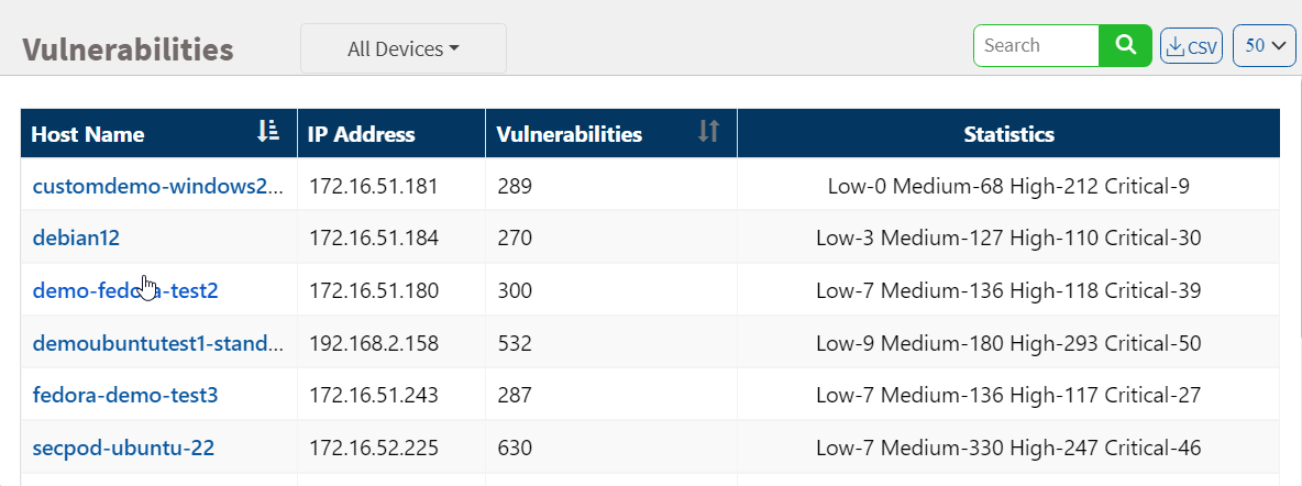 Remediation can be prioritized if there is visibility into the vulnerability category. You can download the excel sheet by clicking on the CSV icon. The file contains information about the vulnerabilities based on the exploitability.