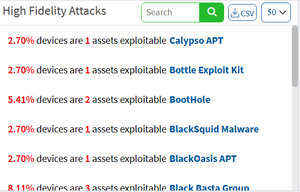 High fidelity attacks pane groups, the vulnerabilities by the exploit kits that can be used to exploit the weakness. This pane shows the high-fidelity attacks which defect the array of attacks vulnerability leads to. In this way, Saner VM predicts having the vulnerability in an organization. On clicking on the highlighted attack name, you will get a description model of the attack. You can download the excel sheet with detailed information by clicking on the CSV icon.