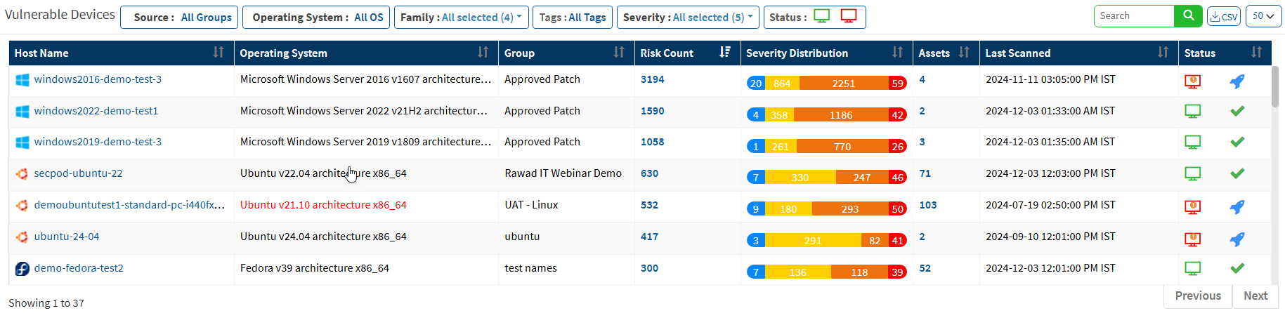This pane lists vulnerable devices with detailed information on risk count based on severity distribution. This pane displays all the devices in the network along with the hostname, operating system, group, count, severity distribution, assets count, last scanned information, and device status. Filter options are provided to narrow the search based on the groups, operating system, family, and status. The Others option in the Family filter will list the network devices. You can download the excel sheet with vulnerable device information by clicking on the CSV icon.