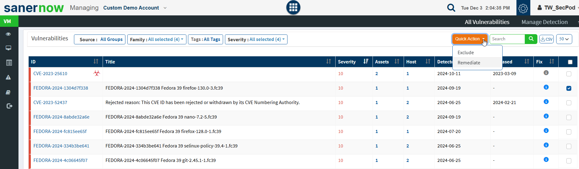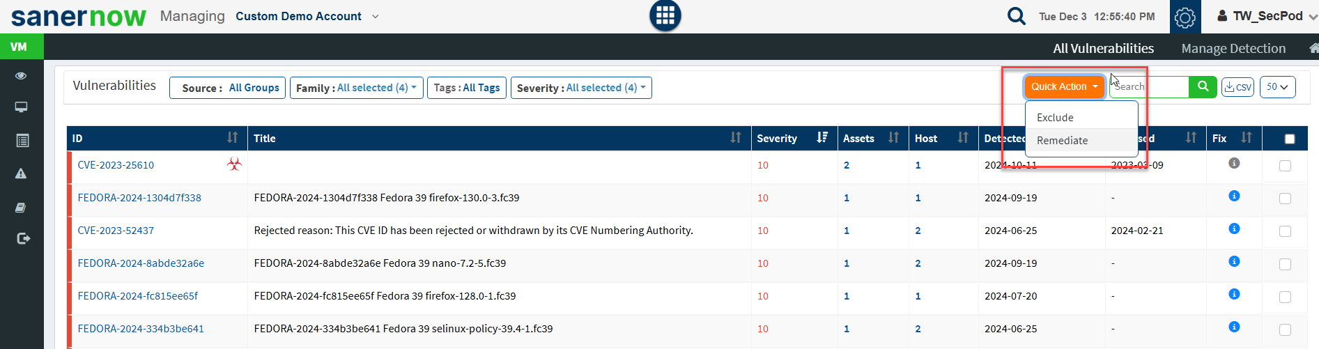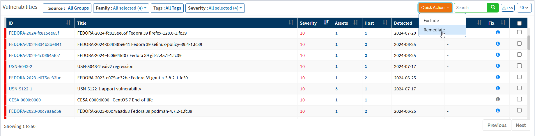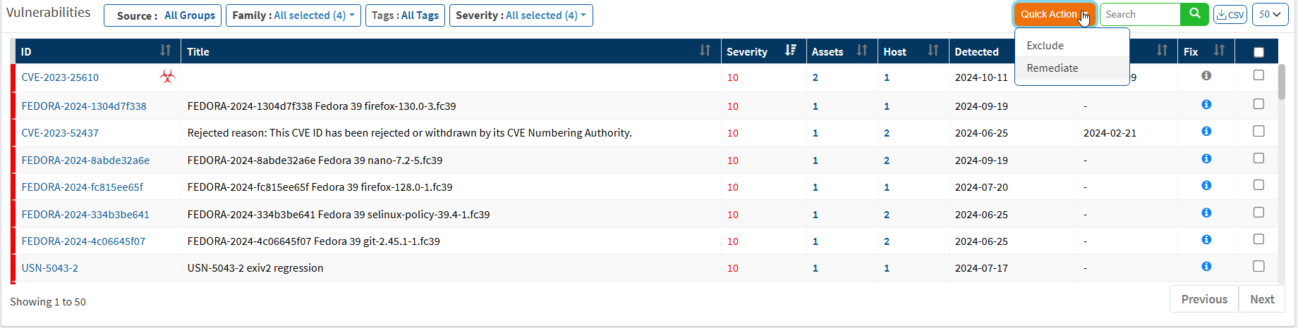 - Select the assets and click on quick action. The vulnerabilities associated with assets can be remediated.