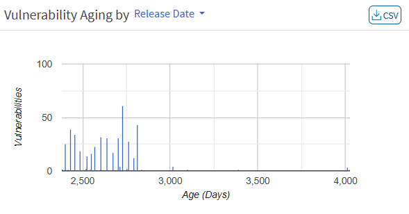 This pane shows vulnerabilities grouped by aging. The number of days since they were detected has not been fixed. The pane shows the age of each vulnerability in an account after its detection. You can download the excel sheet with a list of vulnerabilities based on age by clicking on the CSV icon.